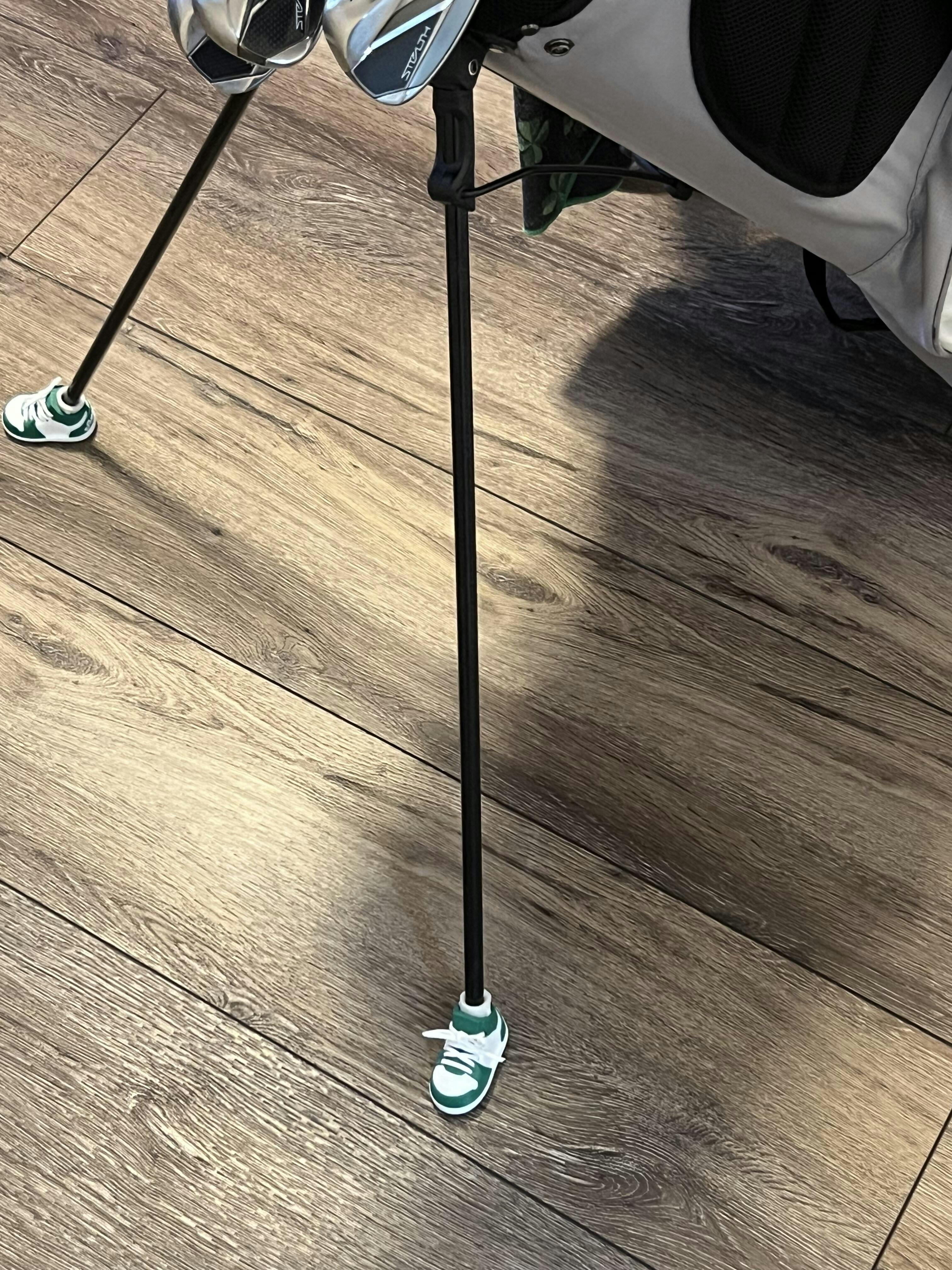 The Green & White Golf Bag Shoe Stands slip onto your bag’s stand legs to add grip, protection, and a bold pop of color. A small upgrade that makes your setup look better and stand more stable on any surface.